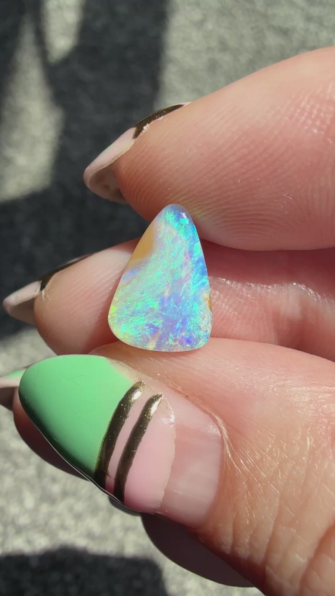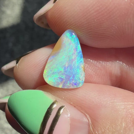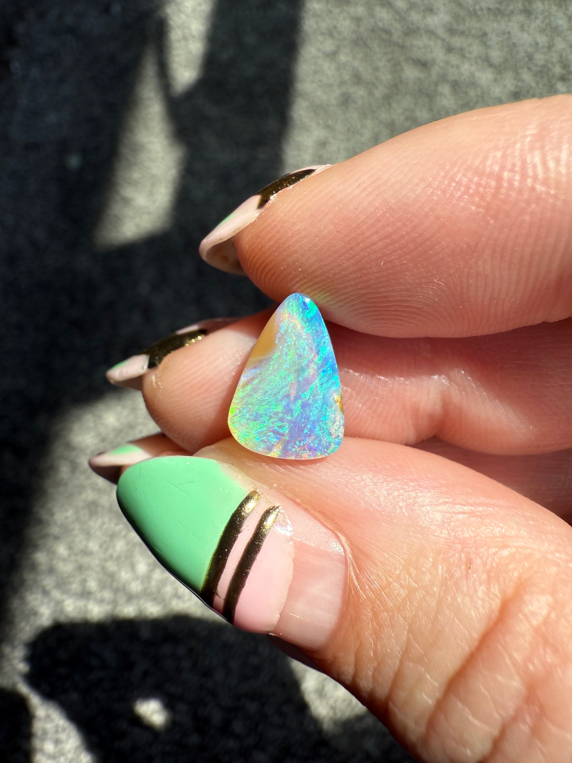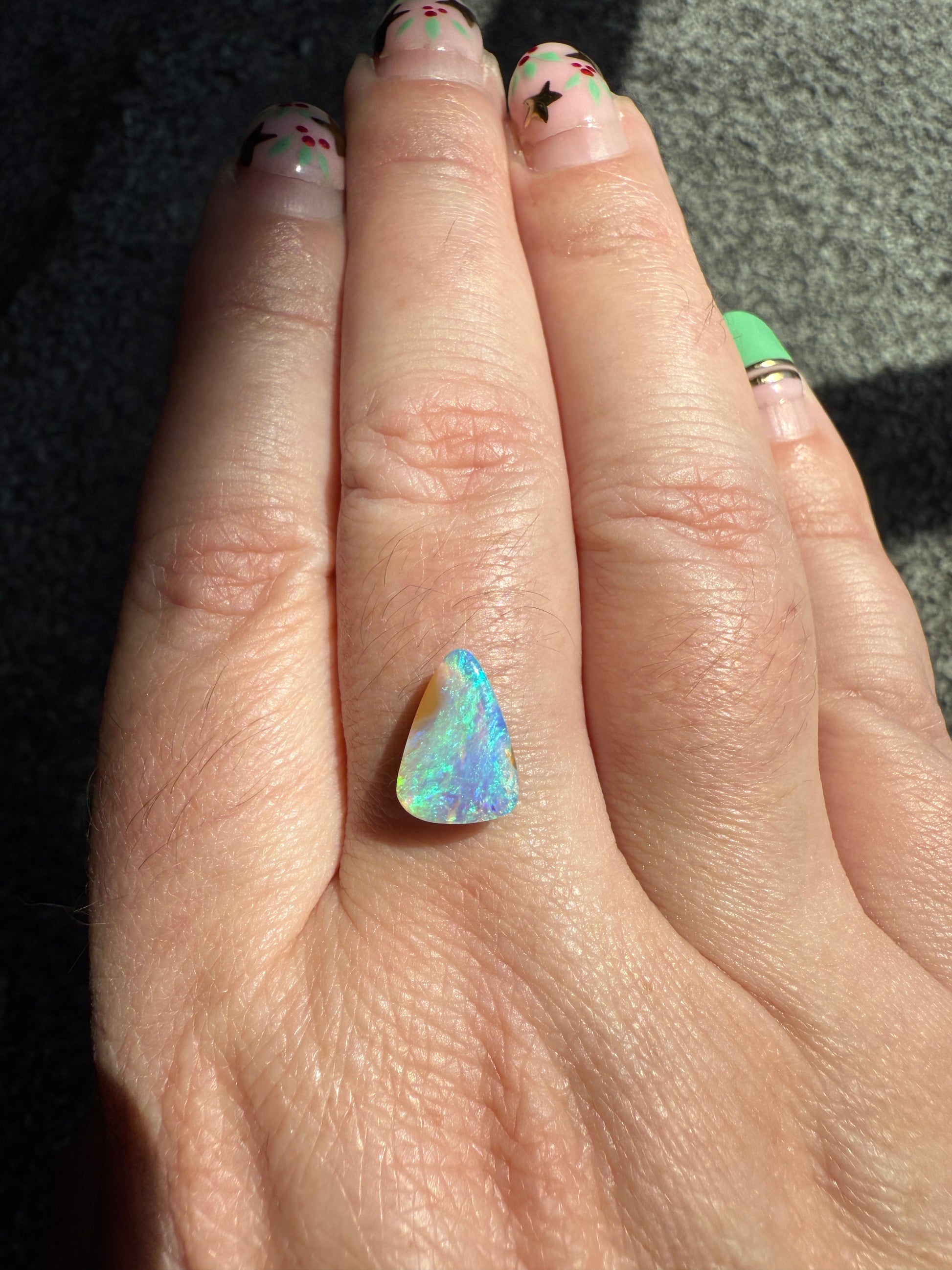 I’ve photographed this opal in both sunlight and shade to show its natural play of colour. Please note that opal colours can appear slightly different depending on lighting and screen settings.