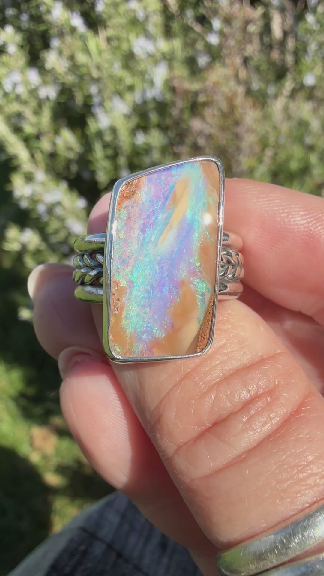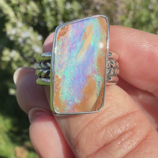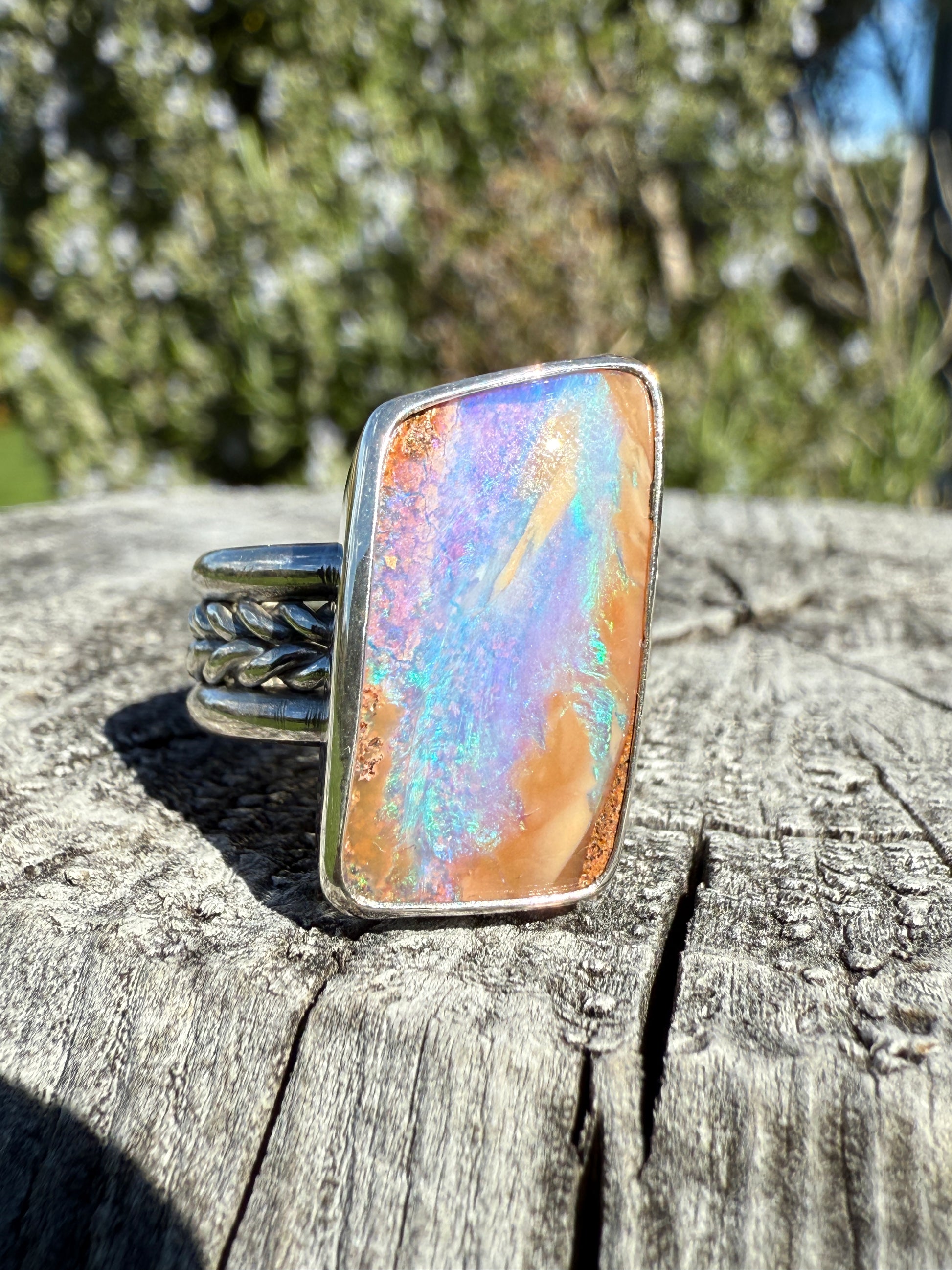 Bathed in sunlight and kissed with colour, this Australian pipe opal ring shimmers like a wildflower catching the first light of spring. Hues of lilac and soft sky blue ripple through its surface, reminiscent of petals brushed with morning dew. Set in handcrafted a sterling silver braided band, this piece feels both grounded and ethereal, a little piece of nature’s magic you can wear.